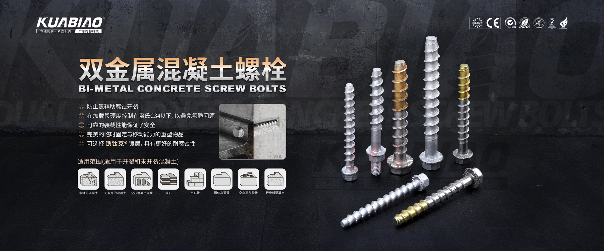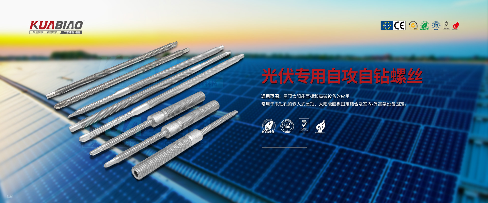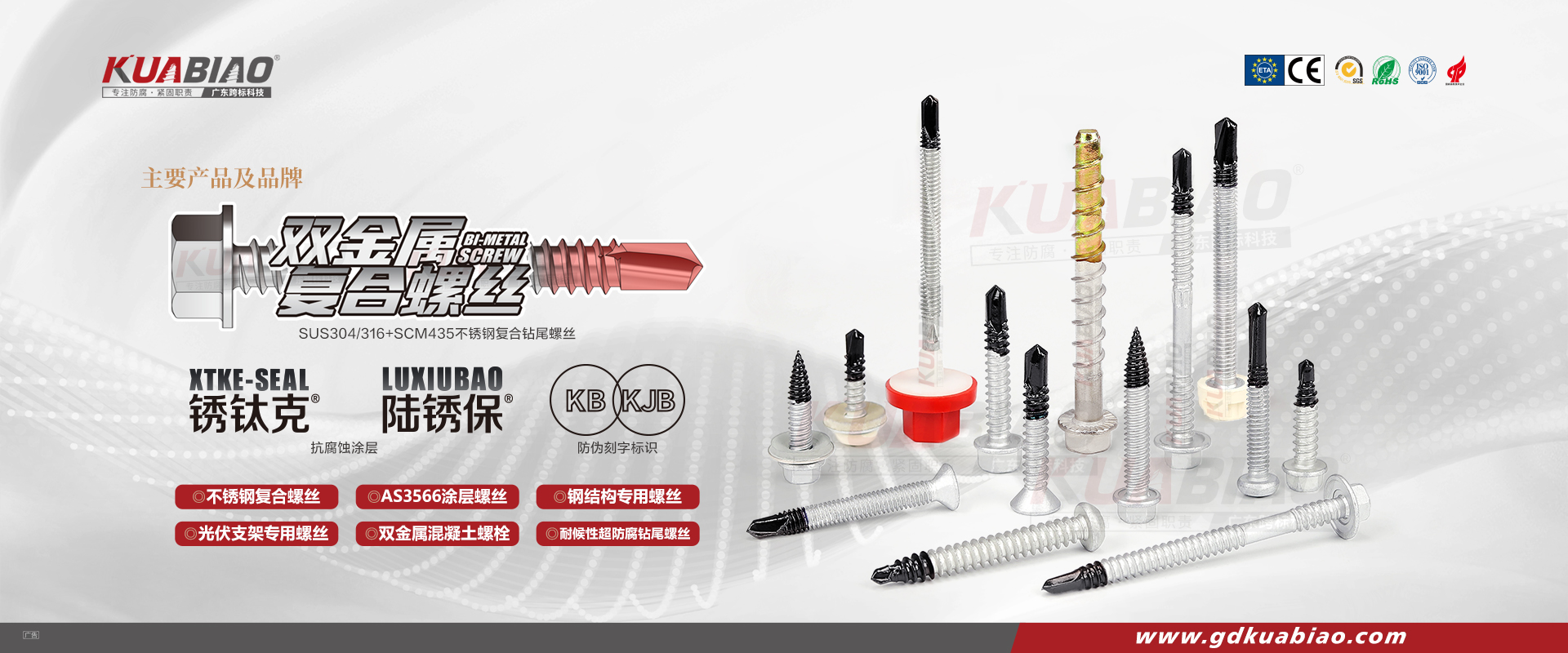 廣東跨標建筑科技有限公司原(東莞市跨標不銹鋼緊固件有限公司)成立于2005年。專注于高品質碳鋼、不銹鋼緊固件的生產及銷售;公司又于2013年成立雙金屬復合螺絲生產車間,是國內雙金屬復合螺絲的專業生產企業。主要生產復合螺絲,涂層螺絲(澳洲標準),不銹鋼螺絲,螺栓,不銹鋼鉚釘。